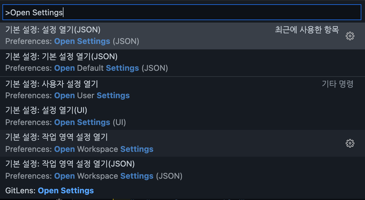 Mac 기준으로 VSCode에서 Cmd + Shift + P 를 입력하면 명령 팔레트가 등장하는데, Open Settings를 입력한다.