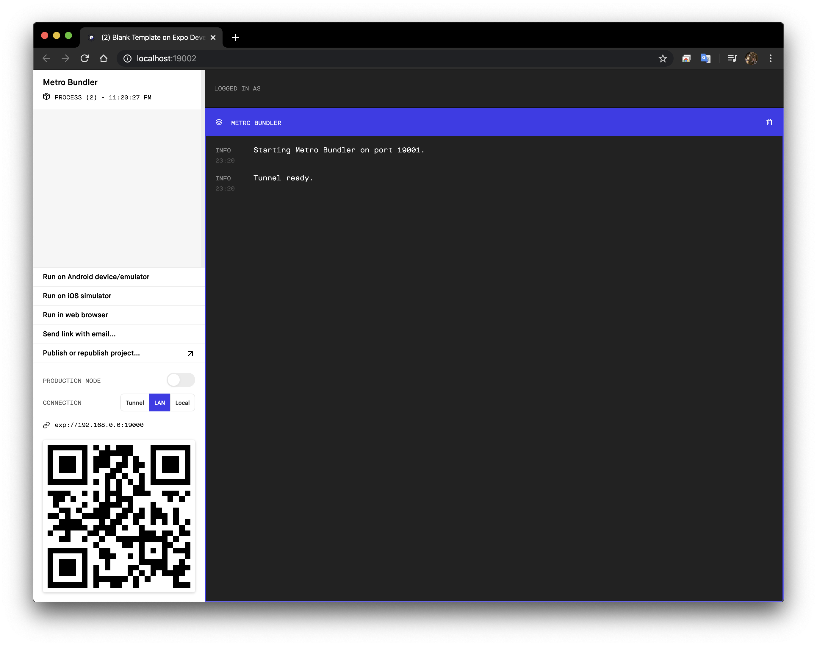 프로젝트가 실행되면서 자동으로 expo dev tool이 실행된다.