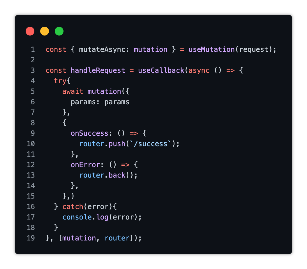 useMutation의 mutateAsync를 destruct하고, mutateAsync만 useEffect의 dependencies로 추가한다.