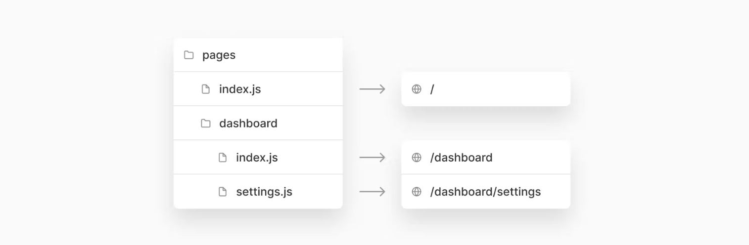 Next.js는 URL을 통해 접근할 수 있는 경로로 “Pages” 디렉토리의 개별 폴더와 파일을 매핑하는 파일 시스템을 사용한다. 각 Page 파일은 React 컴포넌트로 export되고, 파일 이름에 따라서 관련된 경로가 있다.