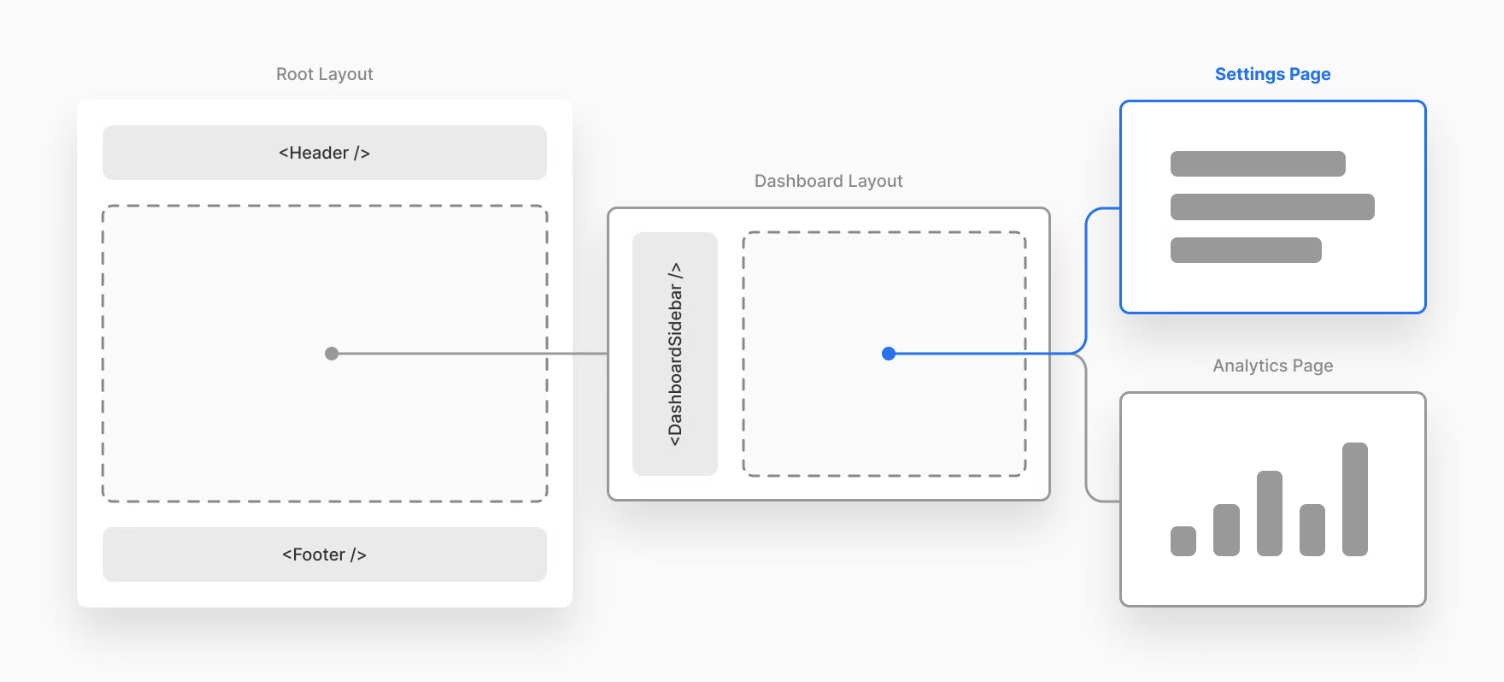 예를 들어 사용자가 /analytics와 /settings 페이지간 이동한다면, React는 페이지 세그먼트를 다시 렌더링하지만 layout은 유지한다.