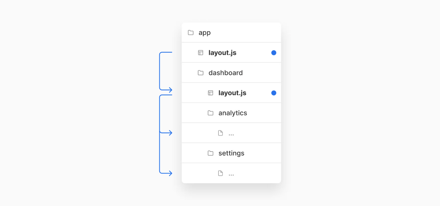 예를 들어, 위의 두 가지 layout을 결합하면, root layout(app/layout.js)은 dashboard layout에 적용된다. 그리고 dashboard/*의 모든 route segment에도 적용된다.