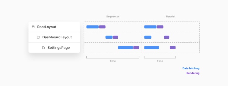 Next.js는 폭포수를 최소화하기 위해 병렬로 data fetching을 시작한다. 예를 들어, data fetching이 순차적이면, route의 각 중첩된 세그먼트는 이전 세그먼트가 완성되기 전까지 data fetching을 시작할 수 없다. 그러나 parallel fetching을 사용하면 각 세그먼트는 같은 시간에 data fetching을 시작한다.